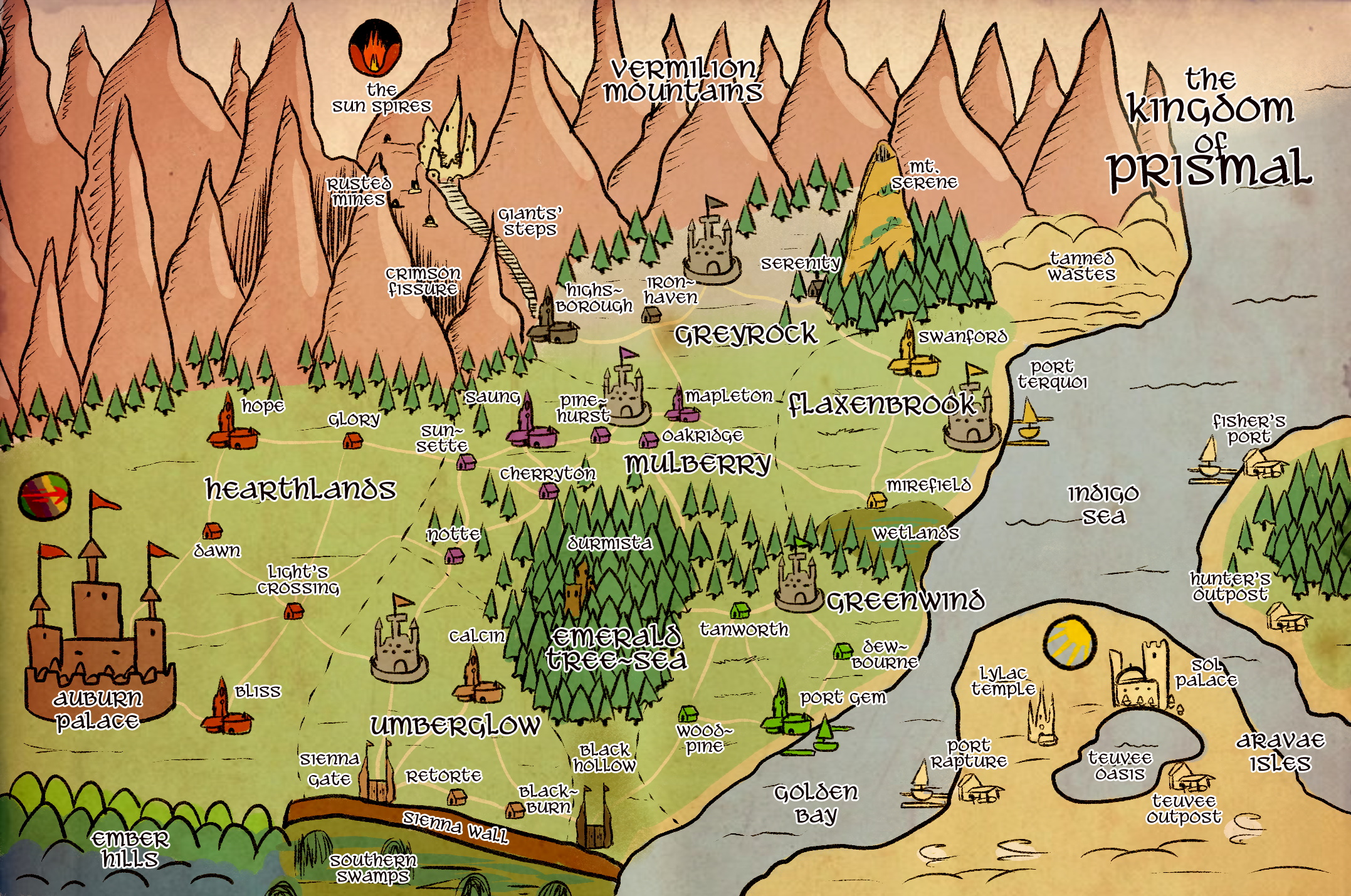 A wilderness of forests, grasslands, and mountains tamed by a diverse group of settlers over 200 years ago, Prismal is the thriving independant kingdom where Court of Roses takes place. They enjoy a strong alliance with the Goliaths of the Vermilion Mountains to the north, and have just begun talks to join an alliance with the Aravae Isles to the southeast.